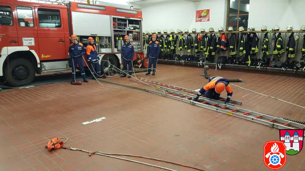 Hier haben wir auch die Möglichkeiten für eine Rettung als Privatperson besprochen. Zusätzlich lernten wir verschiedene Rettungstechniken und Hilfsmittel der Feuerwehr und anderen Hilfsorganisationen für diese speziellen Einsätze kennen. Eine der Rettungskarten, die der Feuerwehr zur Einsatzunterstützung zur Verfügung steht, lernten wir kennen und verwendeten diese im praktischen Teil der Übung. Mit zwei Leitern und vier Rettungsleinen retteten wir im trockenen einen Kameraden, welcher im Eis eingebrochen war. Geübt wurde dies in unserer Fahrzeughalle. Eine Woche später, am 23.01.2019, lernten wir wie man das Einbrechen im Eis verhindert und wie man am besten versuchen kann sich selbst aus dieser gefährlichen Situation zu befreien. Besonders Interessant waren auch die Reaktionen unseres Körpers auf Unterkühlung und die Maßnahmen, welche unser Körper eigenständig durchführt um sich selbst in dieser Situation zu schützen. (Dies haben wir natürlich nur theoretisch besprochen.)
