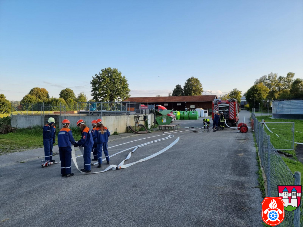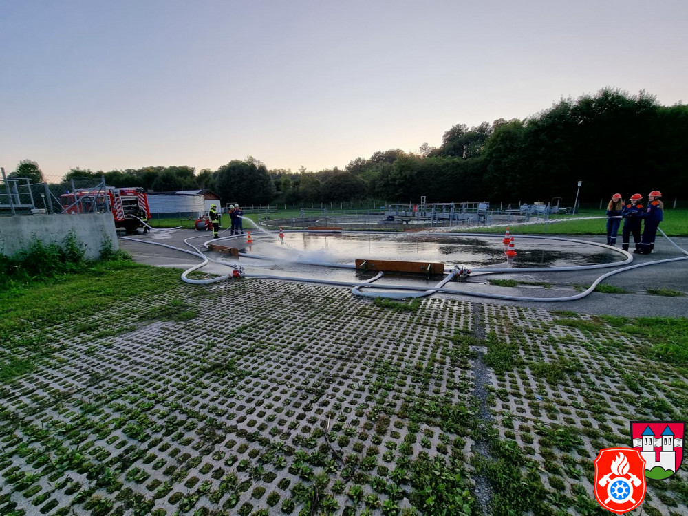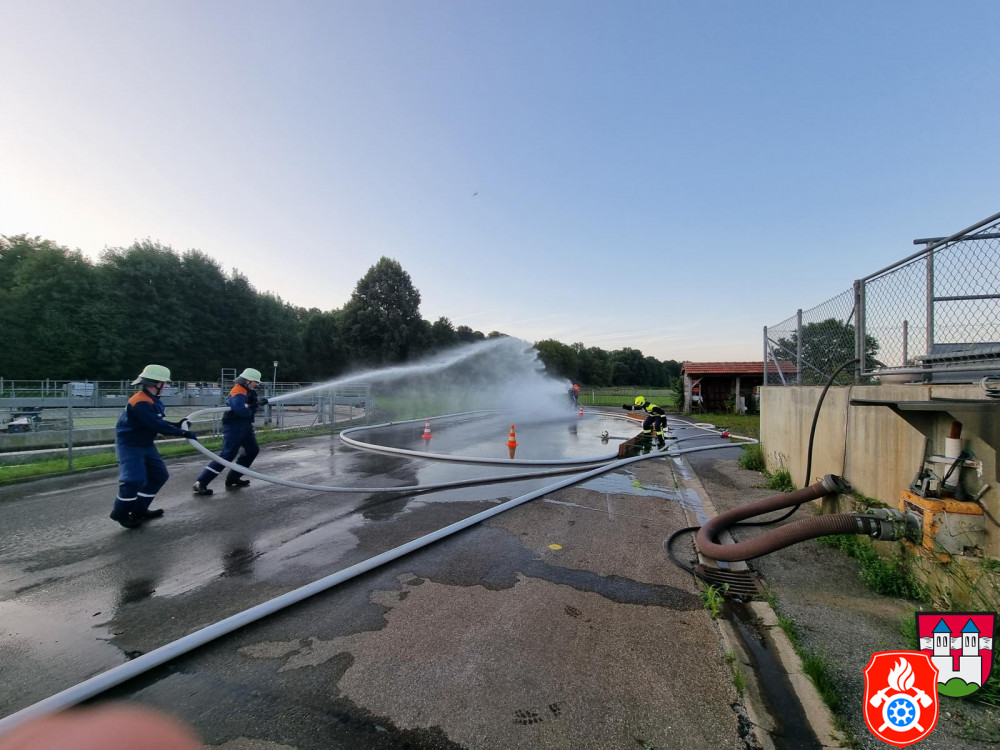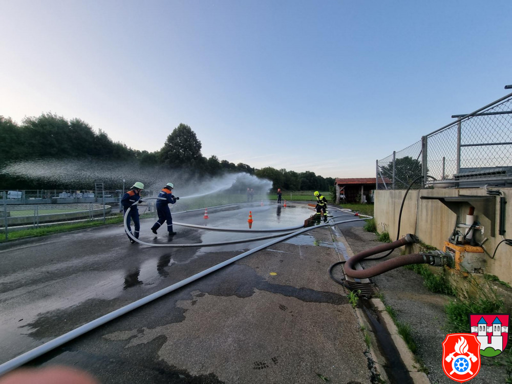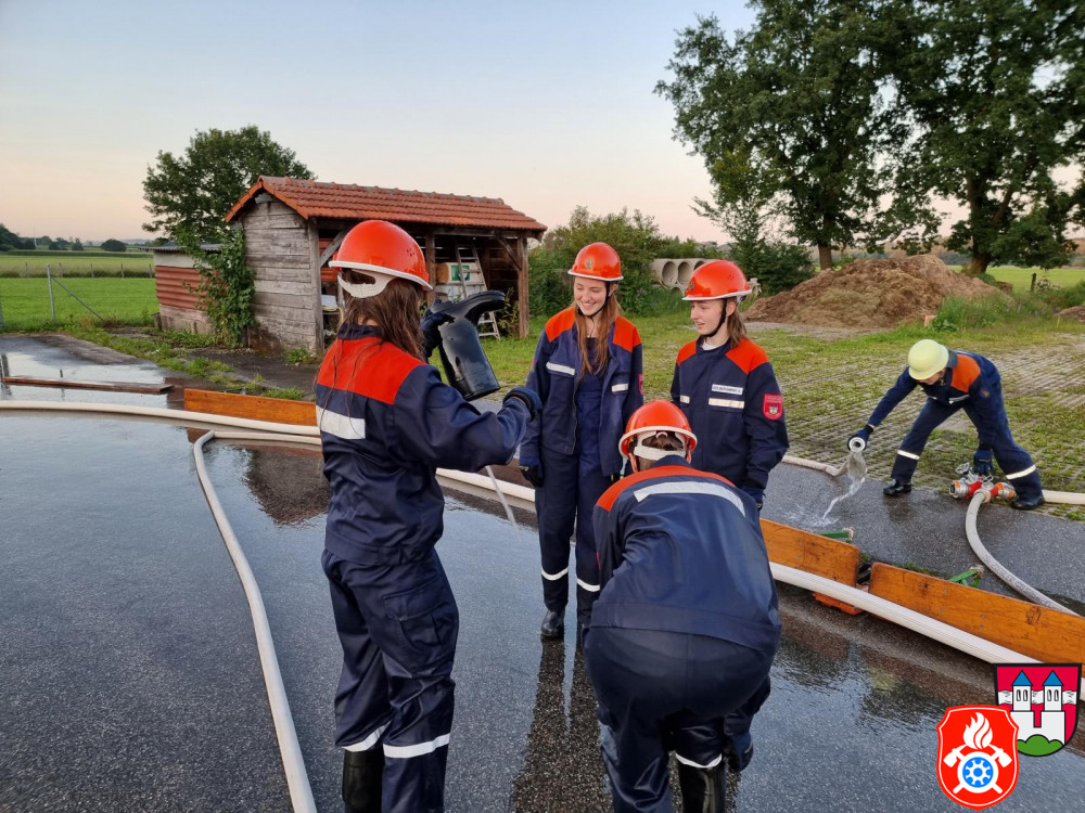 Unsere Jugendwarte nannten das Ganze „spielerisches Lernen“ und uns macht es einfach nur sehr viel Spaß. Als Begrenzung wurden B-Schläuche mit Wasser befüllt und als Tor haben wir Verkehrsleistkegel aufgebaut. Gespielt wurde geschlechtergetrennt in zweier Teams. Die Begeisterung nahm während des Spiels überhand und der Sinn des Spiels „der Ball muss ins Tor“ änderte sich zu „wer wird am meisten Nass“.