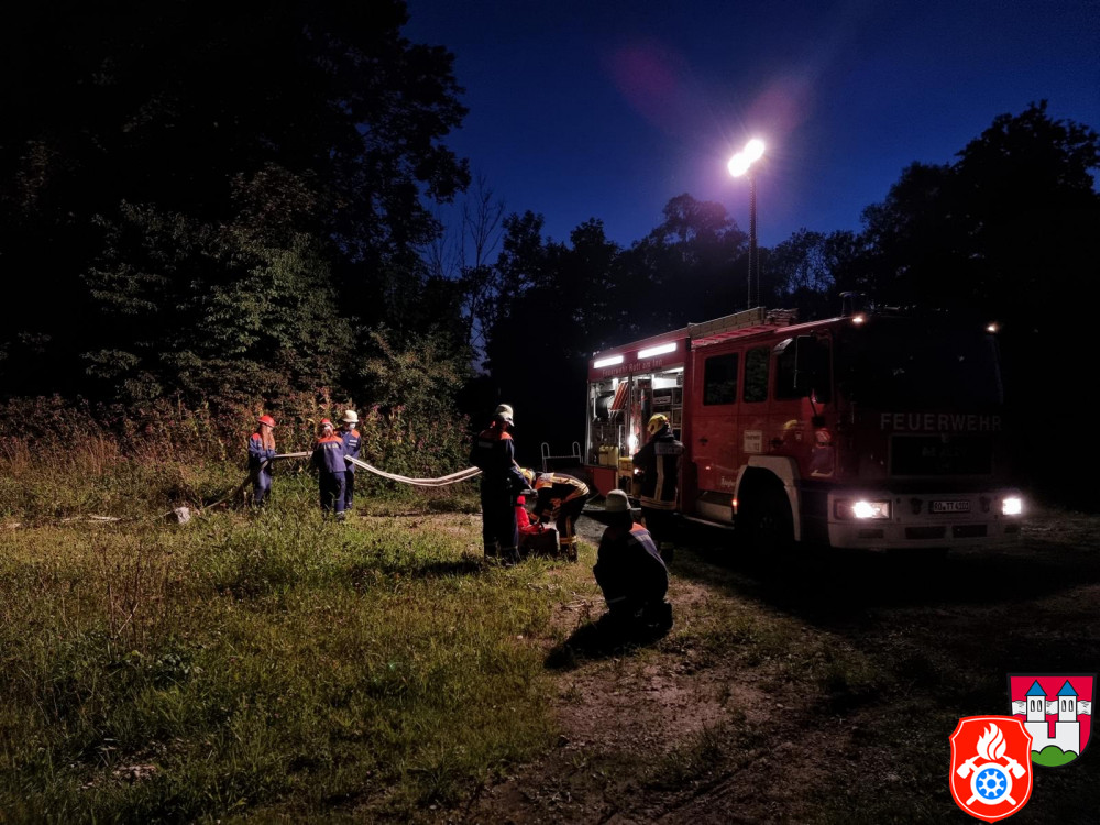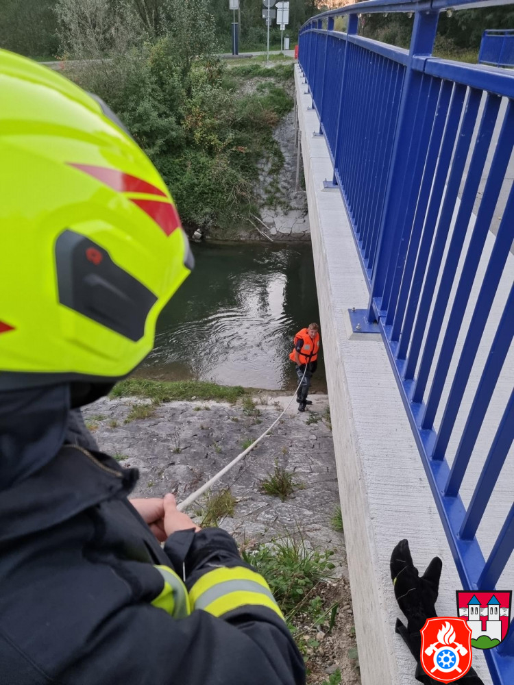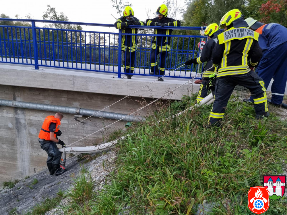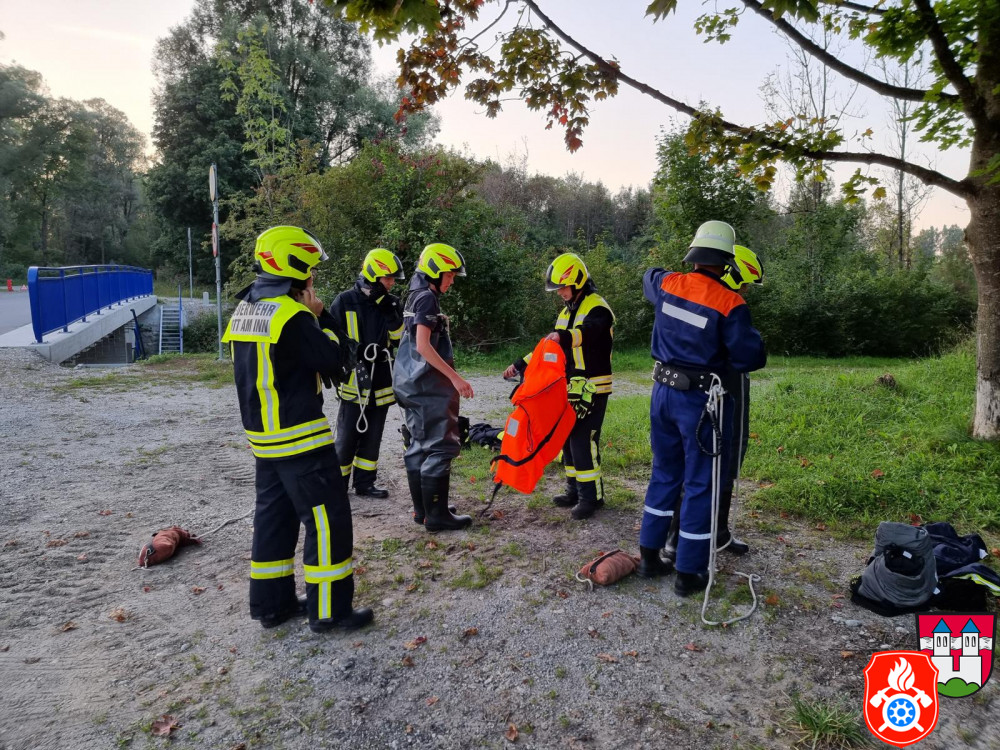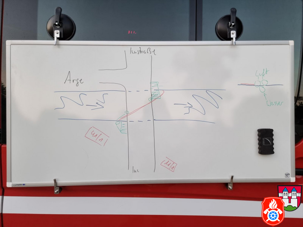 In der Übung waren wir mal wieder sehr dankbar über unsere große Jugendgruppe, da viele Hände benötigt wurden. Wir haben nach Eintreffen an unserer Übungsstelle sofort begonnen eine Verkehrsabsicherung aufzubauen. Gleichzeitig haben wir 2 Feuerwehrler mit Watthose ausgerüstet. Unser Kammeraden hatten jeweils eine Sicherungsperson. Als „Ölsperre“ haben wir insgesamt 3 Schläuche benötigt davon wurden Zwei mit Luft befüllt und der dritte mit Wasser. Das Ganze wurde mit einer Leine zusammengebunden und zu Wasser gelassen. Durch die luftbefüllten Schläuche schwimmt dieses „Paket“ auf dem Wasser und hält somit den Ölfilm zurück.