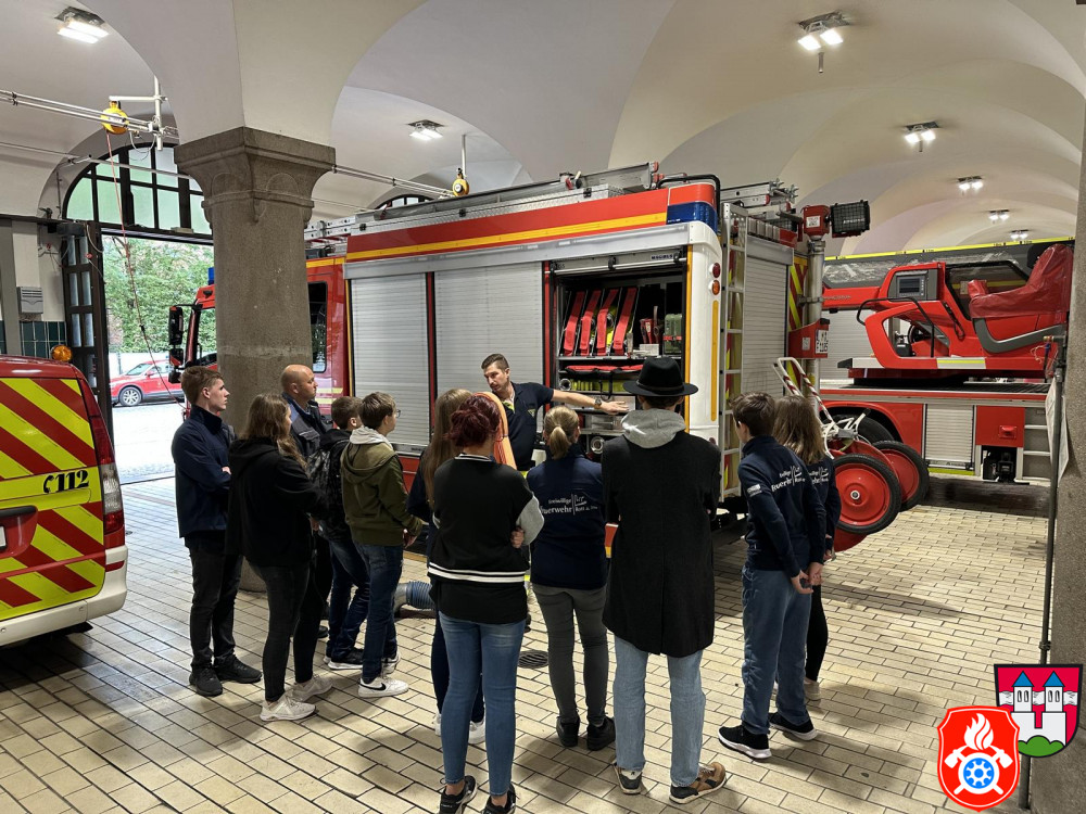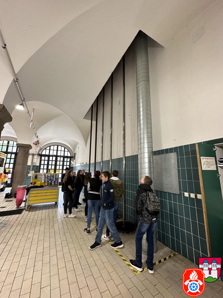 Wir durften uns die verschiedenen Fahrzeuge ansehen und bekamen eine Führung durch das Feuerwehrhaus. Während unseres Aufenthaltes gingen mehrere Alarme bei der Hauptwache ein, sodass bis zum Ende der Führung das Feuerwehrhaus leer war. Alle Fahrzeuge waren im Einsatz.
