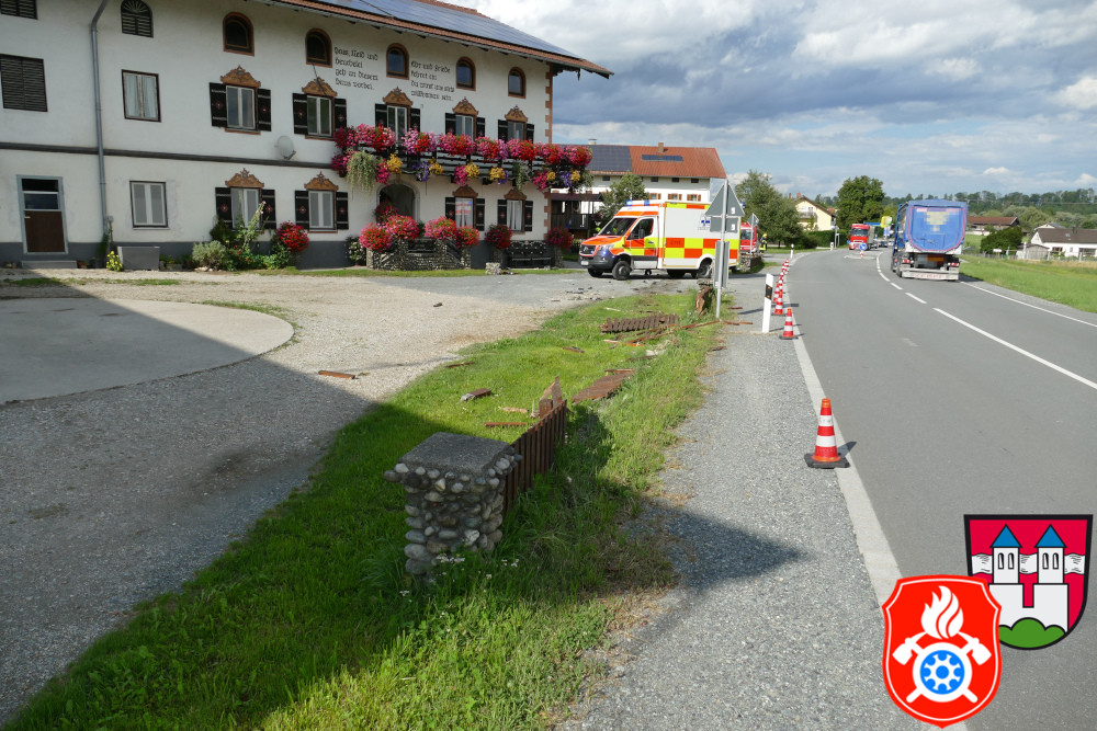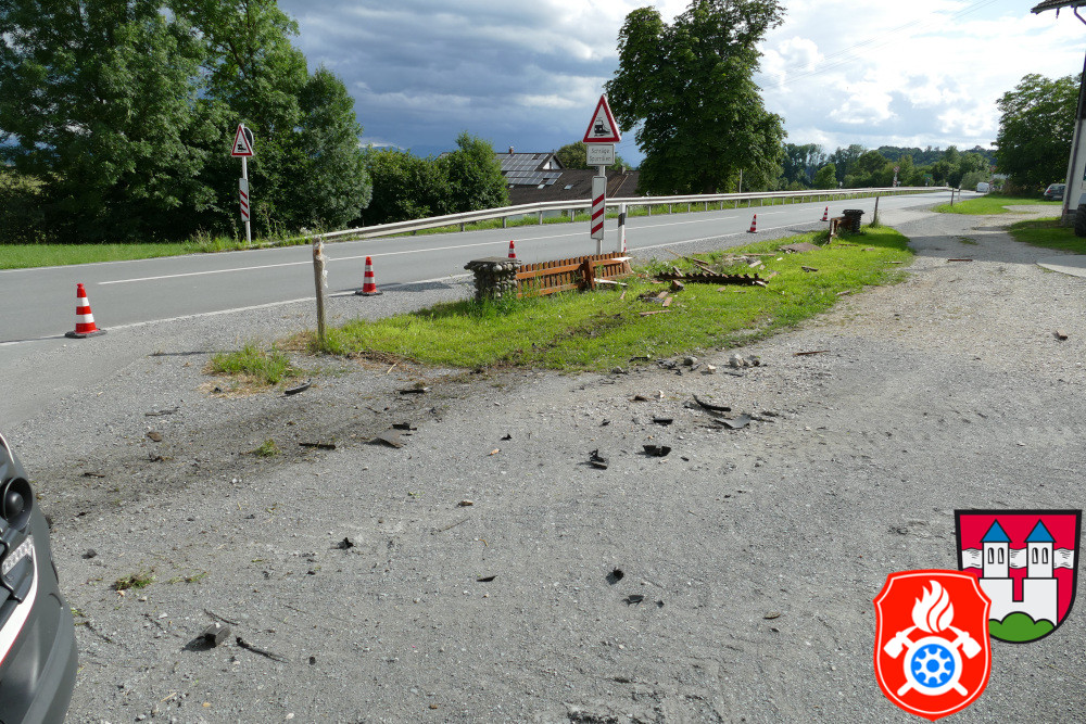 Verkehrsunfall an der B15 in Lengdorf. Ein PKW kam von der Fahrbahn ab und durchbrach einen angrenzenden Gartenzaun.