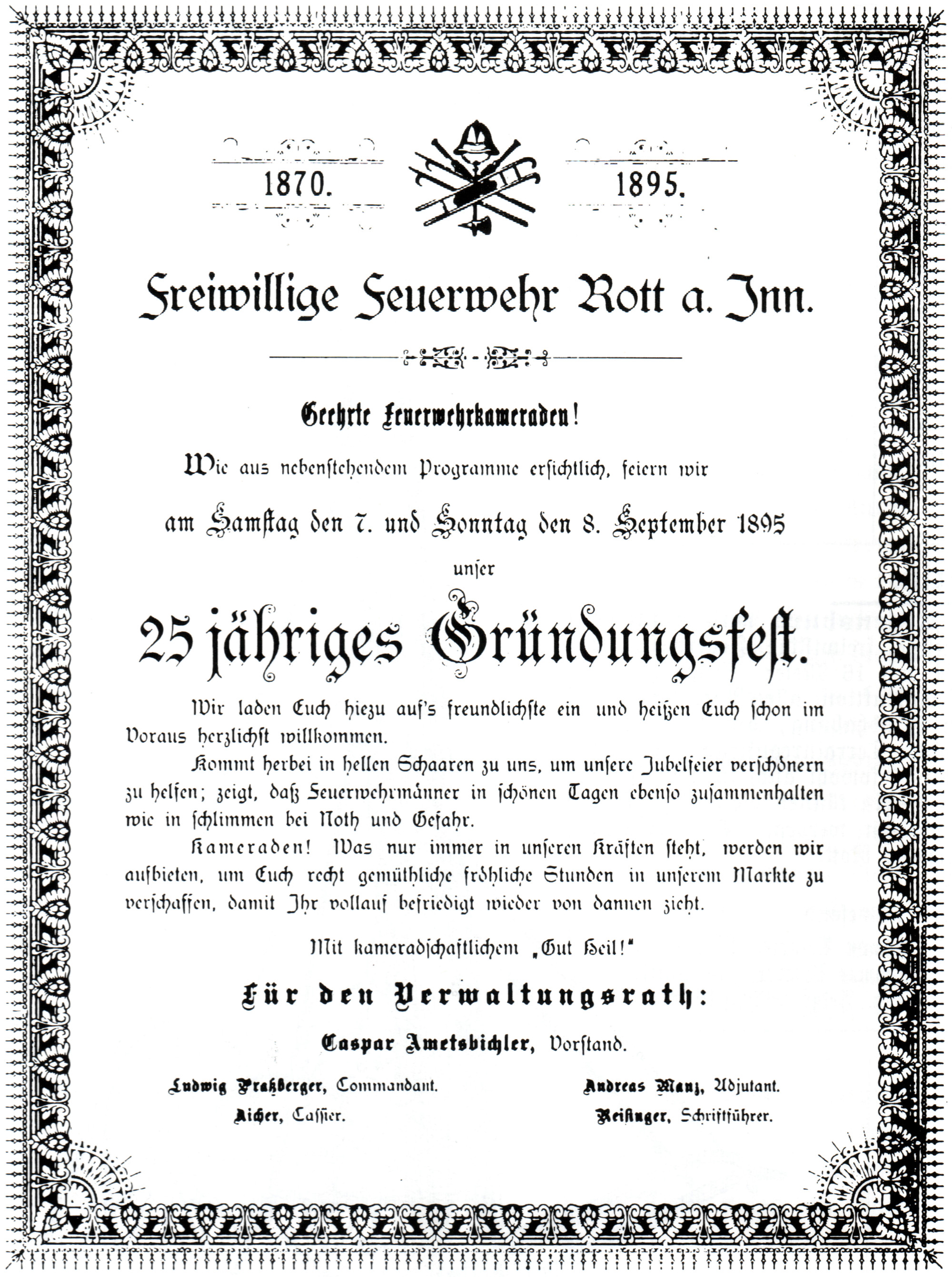 Am 7./8. September 1895 wurde das 25jährige Jubiläum gefeiert. Daran beteiligten sich ausser dem Patenverein Wasserburg noch weitere 36 Feuerwehren und 8 Ortsvereine.