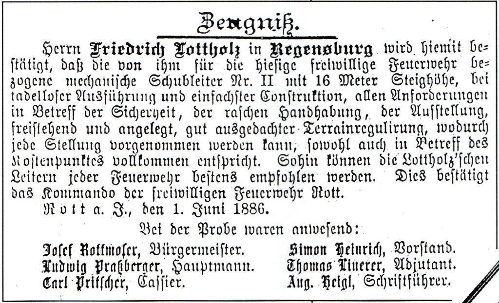 Die Rotter Feuerwehr bewies hier anscheinend Pioniergeist, da sie in dem nebenstehenden Zeugnis in der "Zeitung für Löschwesen" dem Hersteller die einwandfreie Ausführung und Funktion bestätigt.